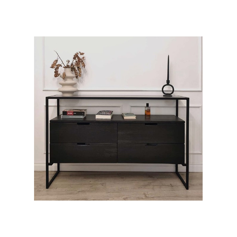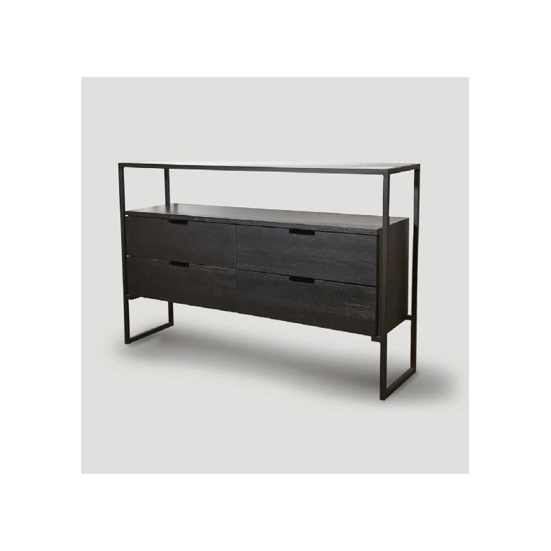 Perfil metálico 20mm. Tapa de cristal ahumado oscuro 6mm. Cajonera fabricada en madera maciza de pino.