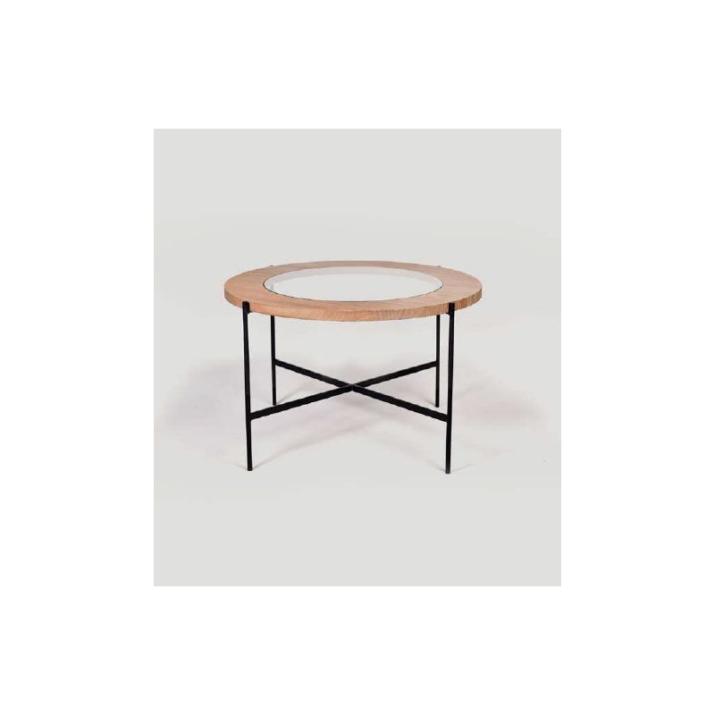 Perfil metálico redondo 16mm. Tapa fabricada en madera de pino de 30mm. Cristal embutido 6mm.
