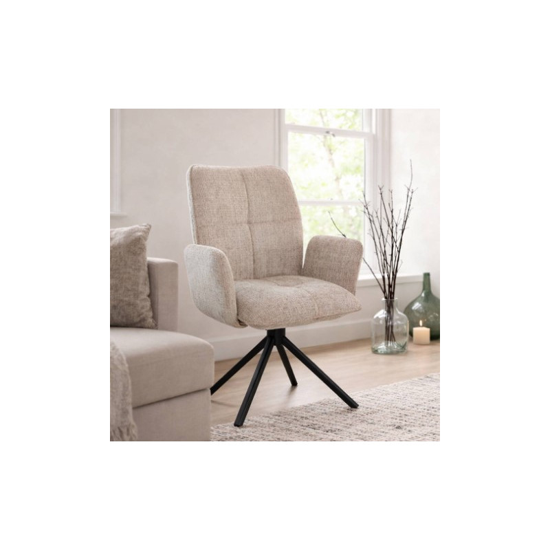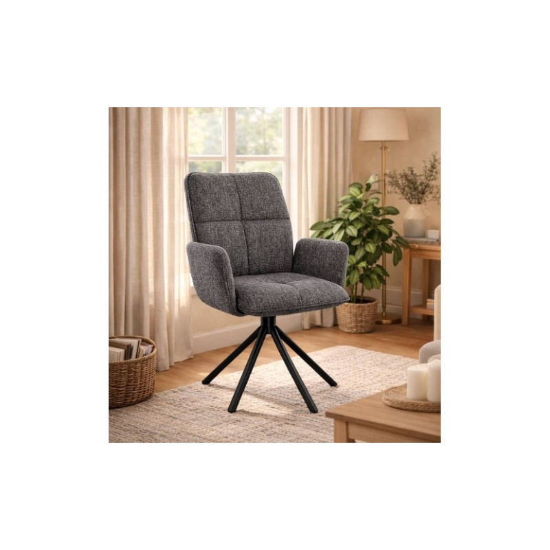Silla con brazos tapizada en tela y patas metálicas en color negro. Asiento y respaldo acolchados, con mecanismo giratorio de 360º. A juego con silla Gala.
