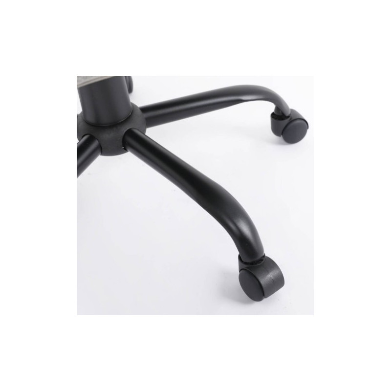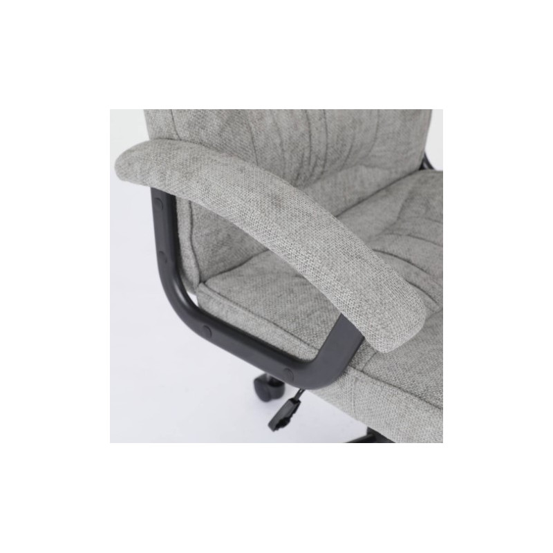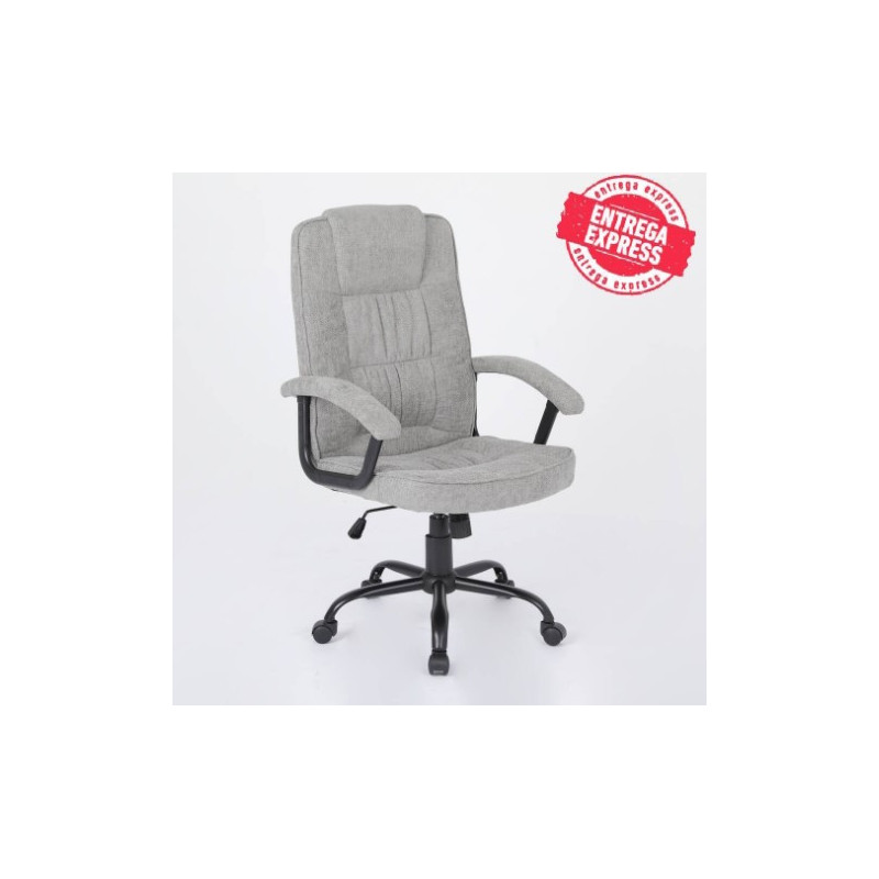 Silla de oficina tapizada en tela color gris claro con brazos de pp y pata araña metálica en color negro. Dispone de mecanismo hidráulico elevador, sistema de balanceo, reposabrazos tapizado y acolchado y ruedas que permiten su desplazamiento. Se sirve desmontada en 1 bultos.