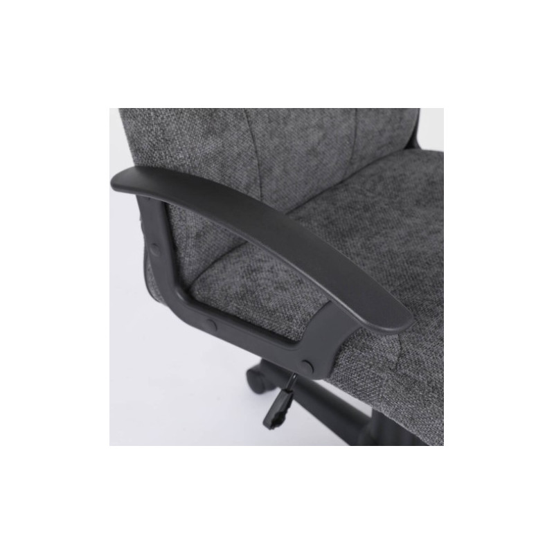 Silla de oficina tapizada en tela color gris oscuro con brazos y pata araña de PP color negro. Dispone de mecanismo hidráulico elevador, sistema de balanceo, reposabrazos y ruedas que permiten su desplazamiento. Se sirve desmontada en 1 bulto.